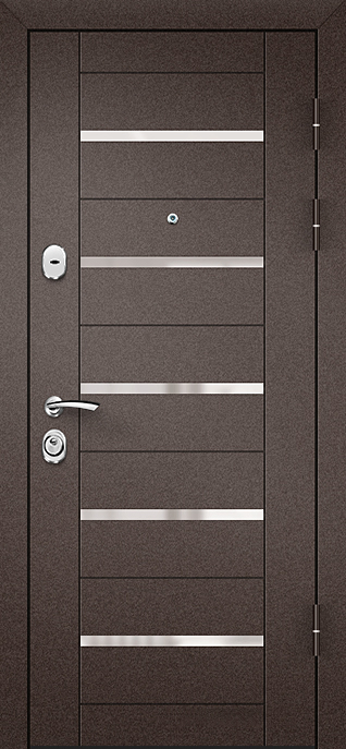 Прочный стальной каркас, лист металла толщиной 2 мм и система блокираторов делают эту модель надежным барьером для квартиры, офиса или частного дома. Внешняя поверхность покрыта молотковым напылением, устойчивым к механическим повреждениям и перепадам температуры, благодаря чему дверь сохраняет аккуратный вид долгие годы. Внутренняя накладка МДФ добавляет уюта и гармонично сочетается с интерьером прихожей. Зеркало на полотне выполняет не только декоративную функцию, но и делает пространство визуально шире. Зеленая входная дверь в квартиру №2 комплектуется двумя замками российских производителей — сувальдным Просам и цилиндровым Мосрентген, каждый из которых оснащён тремя ригелями. Два контура резинового уплотнения помогают минимизировать сквозняки и шум, а возможность выбрать сторону и тип открывания делает установку максимально удобной. При необходимости отделку, замки и дополнительные элементы можно адаптировать под индивидуальные требования. Зеленая входная дверь в квартиру №2 от производителя: быстрое изготовление и монтаж в Обнинске, индивидуальные размеры, широкий выбор материалов и фурнитуры, официальная гарантия до 10 лет.
